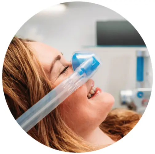 Nitrous oxide sedation is a medical procedure in which the patient inhales a nitrous oxide-oxygen mixture through a custom-fit Baldus disposable double-nasal mask. Nitrous oxide has a calming and anxiety-relieving effect, thus ensuring a more relaxed dental procedure with a reduced swallowing reflex, minimized gagging, and reduced pain perception.